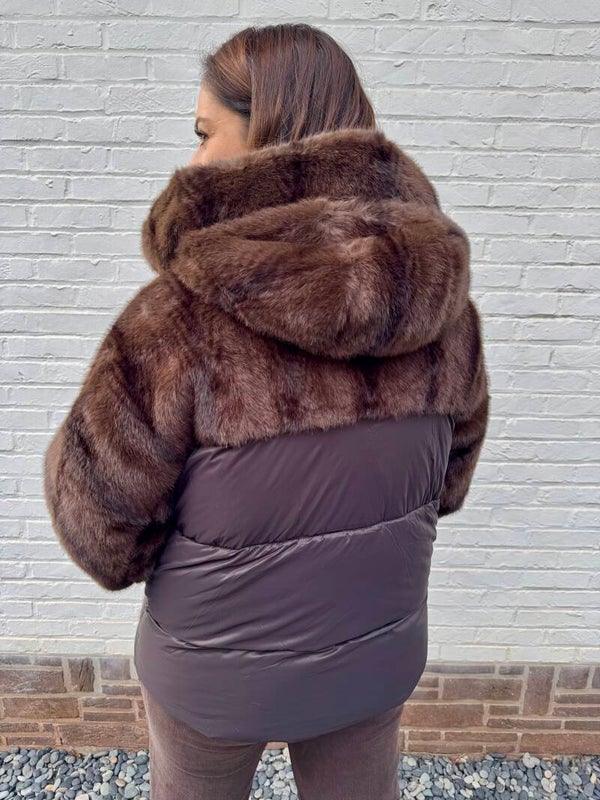 De jas heeft aan het einde prachtige gebreide mouwen, 2 zakken en een kap.