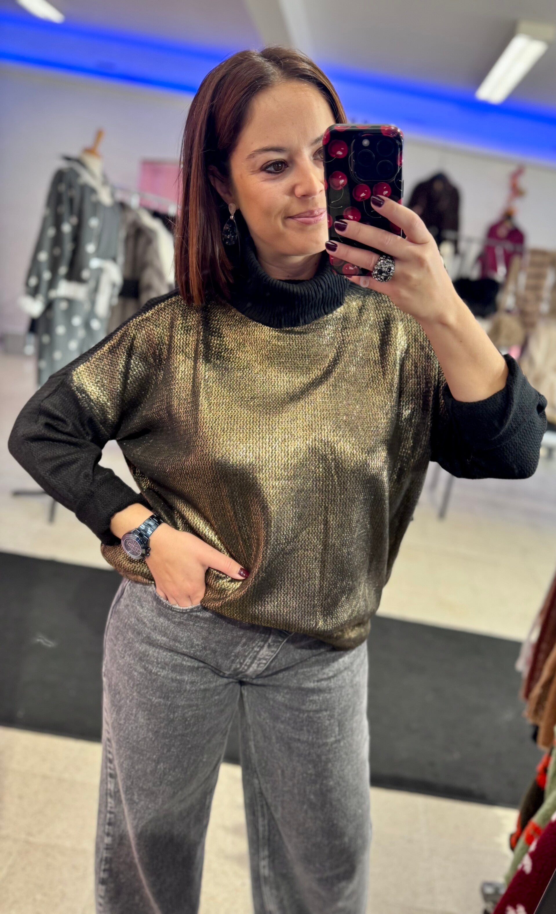 Licht en zacht trui'tje met goud accenten aan de voorzijde.