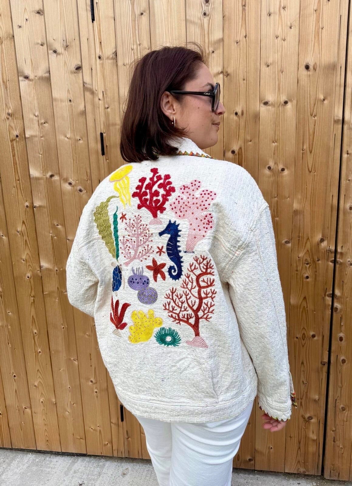 De kraag, mouwen en zakjes zijn afgewerkt door een multicolor stiksel.